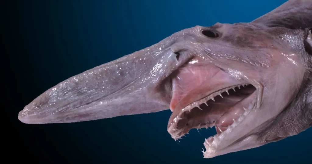 The goblin shark (Mitsukurinaowstoni) is a “living fossil” that lives in the deep sea and is renowned for its strikingly ancient appearance. With a long, flat, sword-like snout that hangs over a jaw full of sharp, nail-like teeth, it is an incredibly strange-looking animal. Its jaw is tucked under its head when it is at rest, but when it feeds, its most hideous feature is exposed. In order to snatch prey, the goblin shark uses elastic ligaments to “slingshot” its entire jaw forward at a remarkable speed, making it the shark with the fastest jaw protrusion known to man. The goblin shark’s long, sensitive snout is covered in electroreceptors called ampullae of Lorenzini, which enable it to detect the weak electrical fields produced by other animals in the dark abyss where it lives.